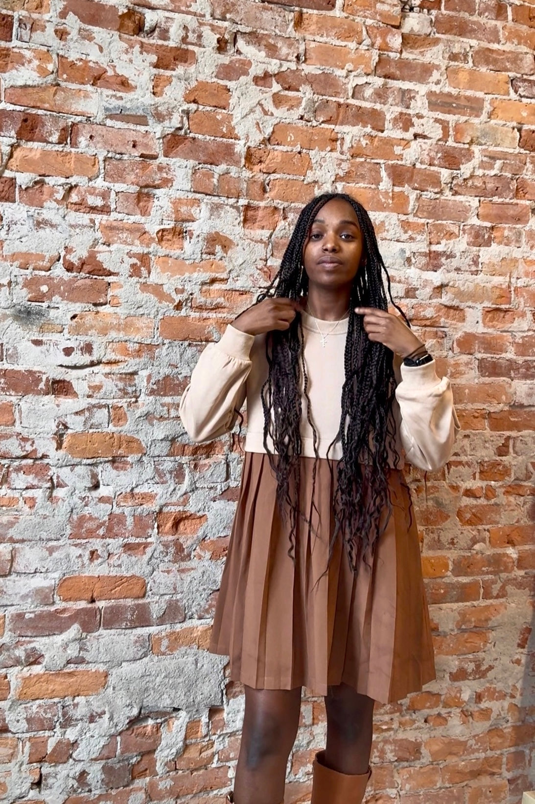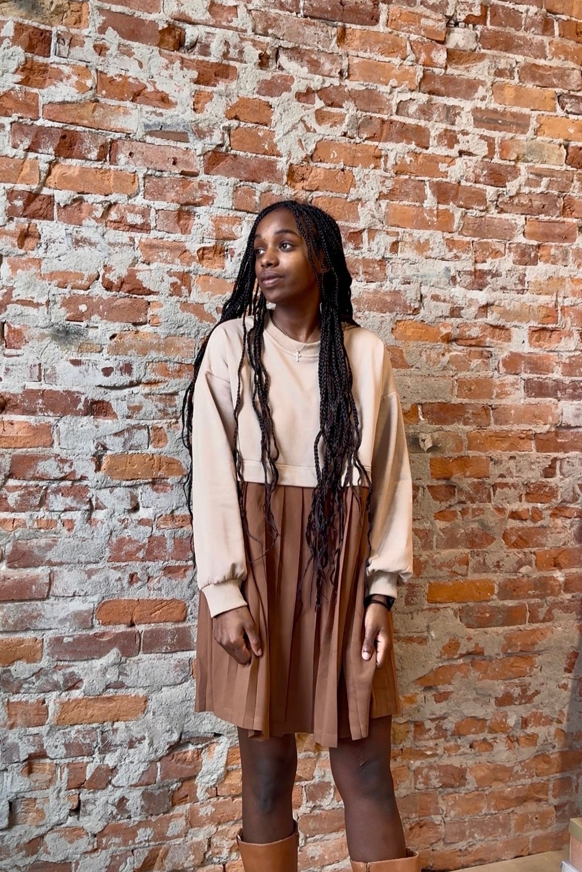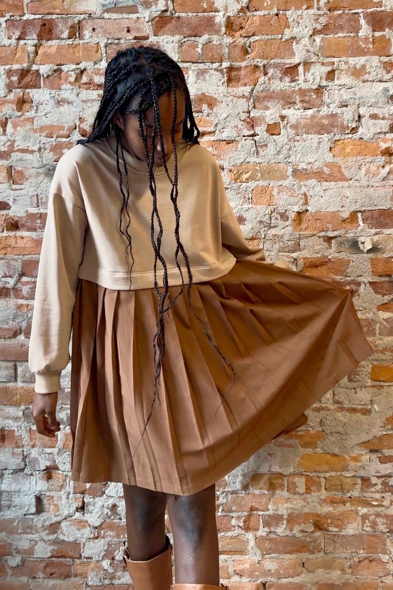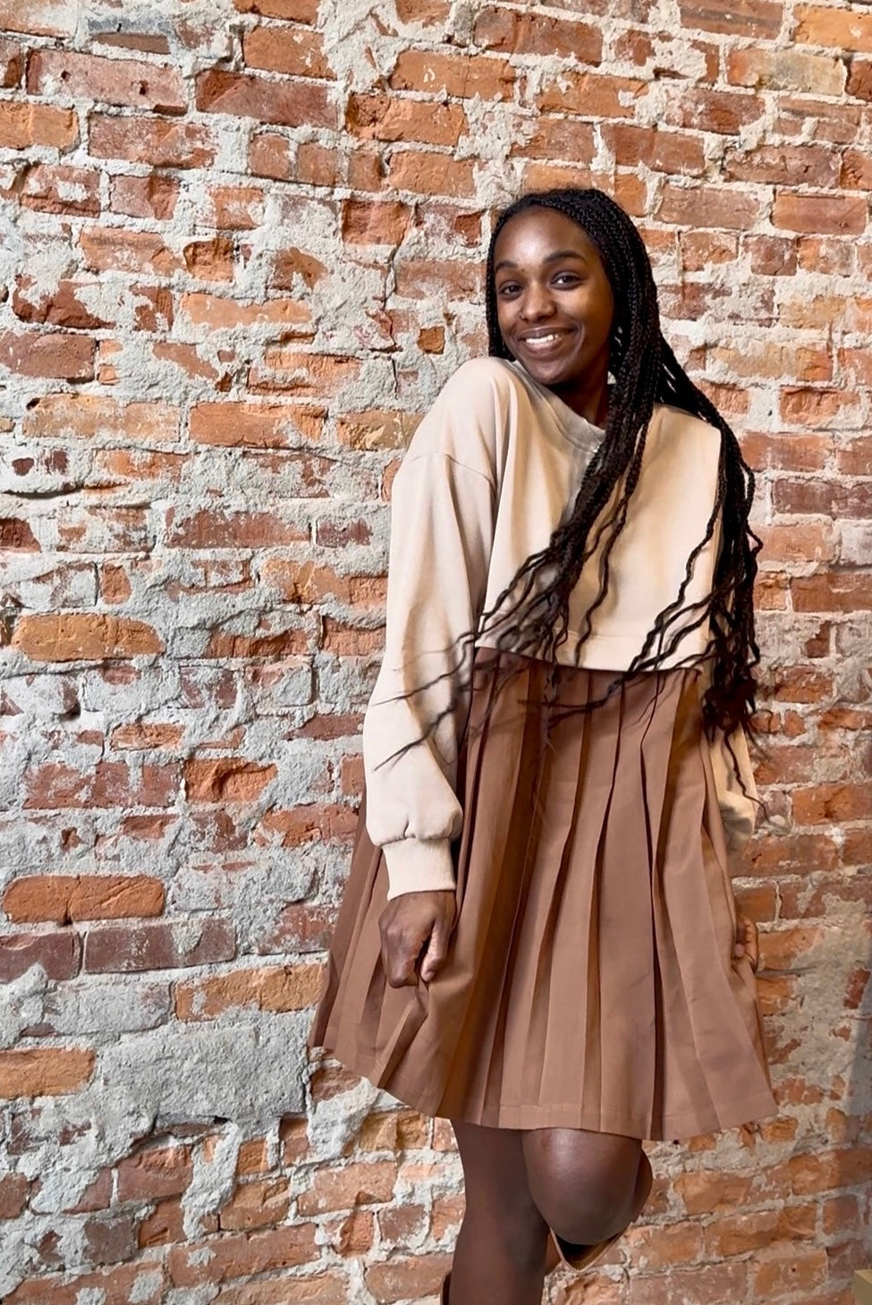 Sweatshirt twofer mini dress with pleated skirt.