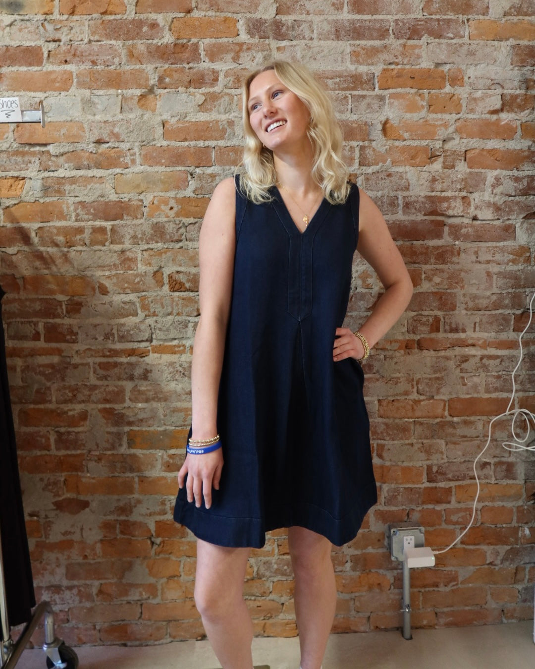 V-neck sleeveless A line dress. Relaxed silhouette. Front center seam with subtle inverted pleat.