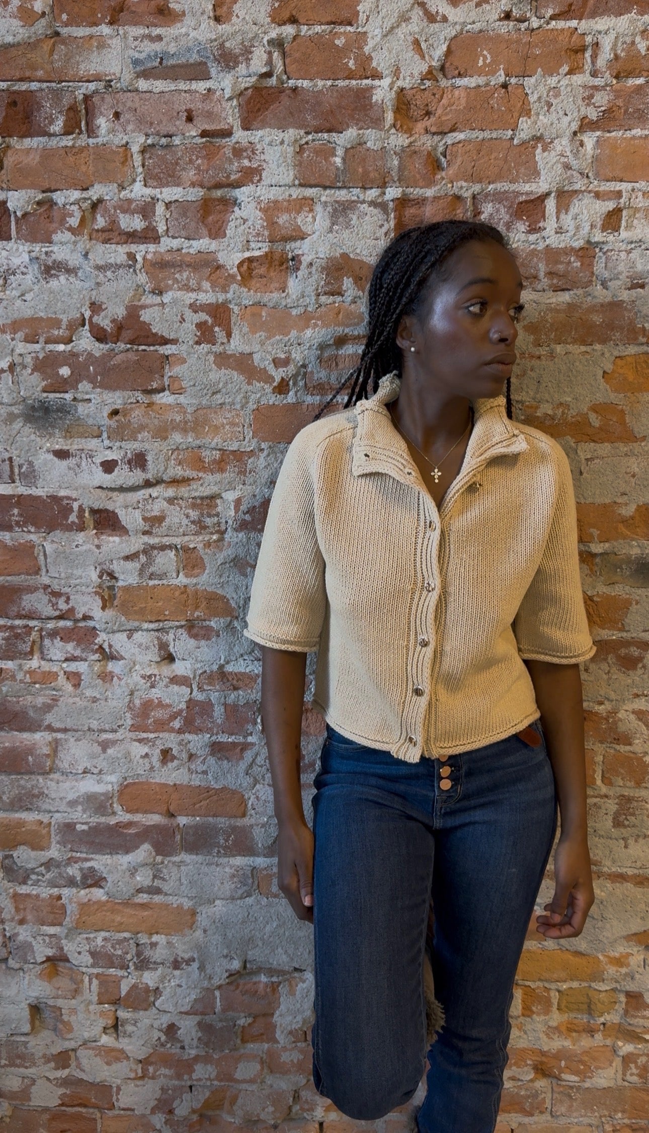 Short sleeve cardigan with functioning buttons.